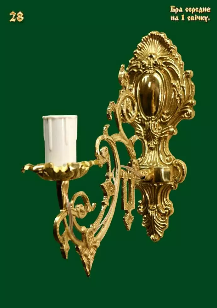 Бра настінна широка, дворіжкова ручної роботи, золотистого кольору, на 1 електричні лампи у вигляді свічок. За бажанням електричні лампочки можна замінити на свічники для свічок будь-якого діаметру.