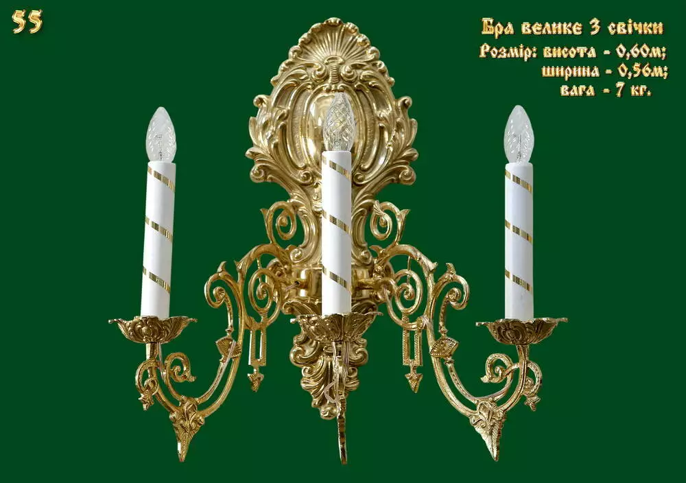 Велике церковне бра на три свічки. В якості основного матеріалу для виготовлення була використана латунь. Цей матеріал ідеально підходить для виготовлення подібних виробів, тому що при правильному догляді він надовго збереже свій первозданний зовнішній вигляд.