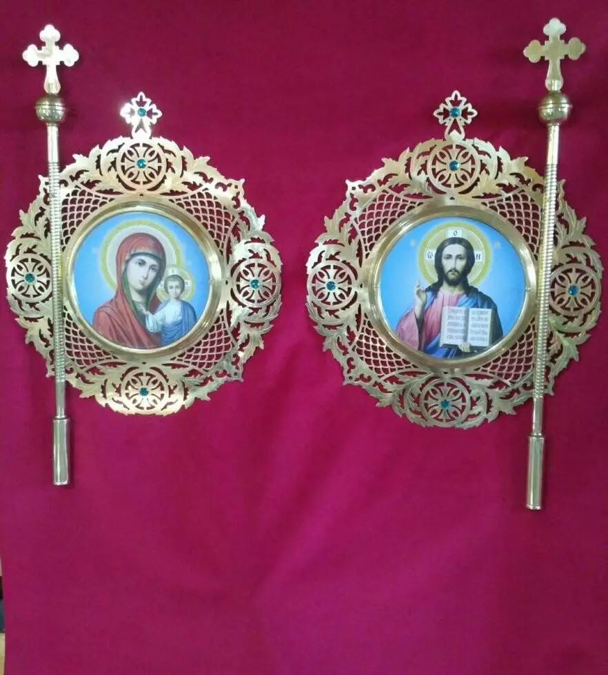 У нашому інтернет-магазині ви можете купити красиві латунні хоругви з образами Господа та Пресвятої Богородиці, а також замовити виготовлення прапорів за власними ескізами. Наші можливості дозволяють виконувати роботи із золоченням, декоруванням камінням, карбуванням, вишитими іконами.