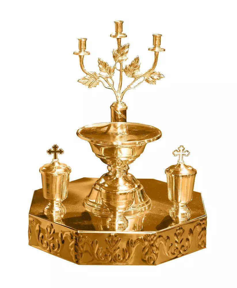 Пропонуємо всенічні блюда, які стануть справжньою окрасою урочистого Богослужіння. Набір складається з підноса з трьома ємностями з кришками, підставки та свічника на три свічки.