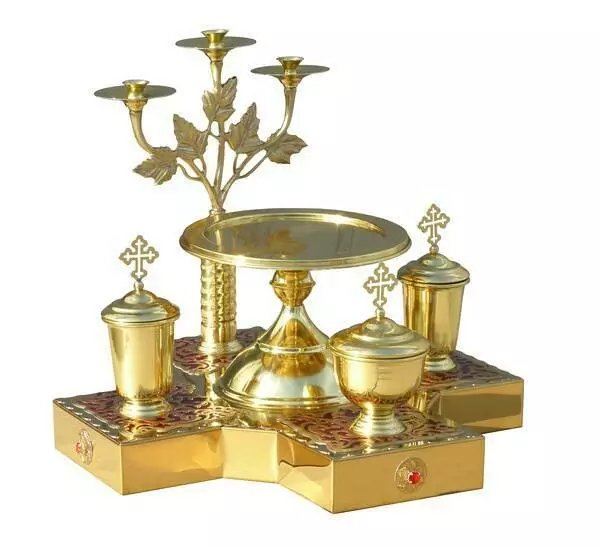 Пропонуємо всенічні блюда, які стануть справжньою окрасою урочистого Богослужіння. Набір складається з підноса з трьома ємностями з кришками, підставки та свічника на три свічки.