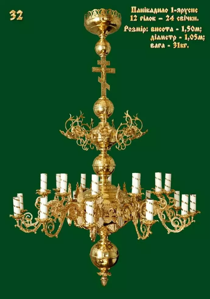 Купити панікадило ручної роботи, золотистого кольору, 1 одноярусне на 12 електричних ламп у вигляді свічок. За бажанням електричні лампочки можна замінити на свічники для свічок будь-якого діаметра.