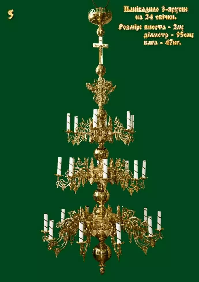 Панікадило ручної роботи, золотистого кольору, 3 двоярусні на 24 електричні лампи у вигляді свічок. За бажанням електричні лампочки можна замінити на свічники для свічок будь-якого діаметру.