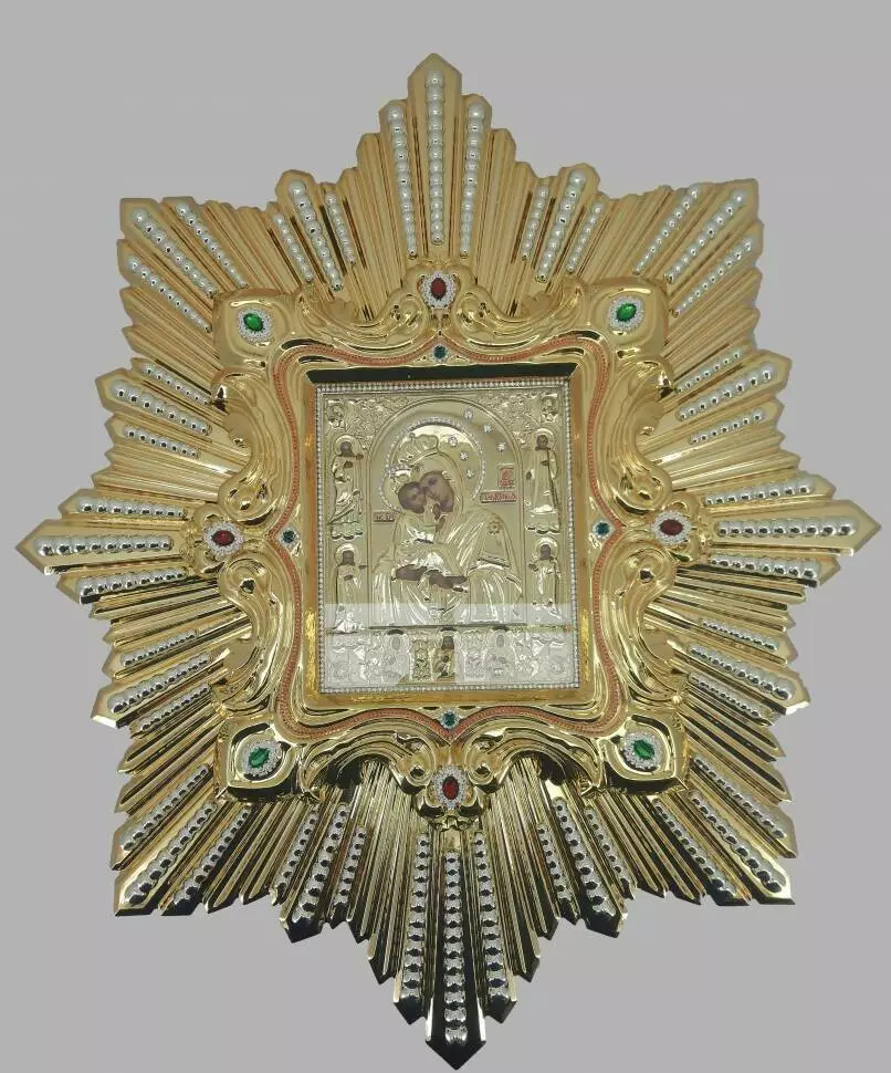 У свою чергу, люди також намагаються віддати належне образу, що позначилося і на зовнішньому вигляді спускної ікони. Вона завжди виготовляється в особливому стилі, в обрамленні сяйва восьмикінцевої зірки, прикрашена дорогоцінним камінням, перлами, золотими накладками. і не кожен храм може собі дозволити таку покупку. Ми пропонуємо не менш красиві, але більш доступні варіанти спускових ікон, а також виготовляємо їх гальванічні ікони на замовлення.